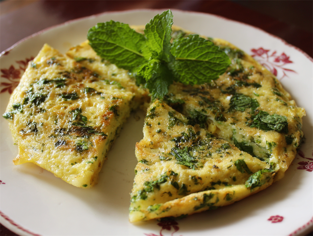 Fluffy omelet packed with parsley, coriander, and mint — just like mom makes it, but lighter and high in protein.